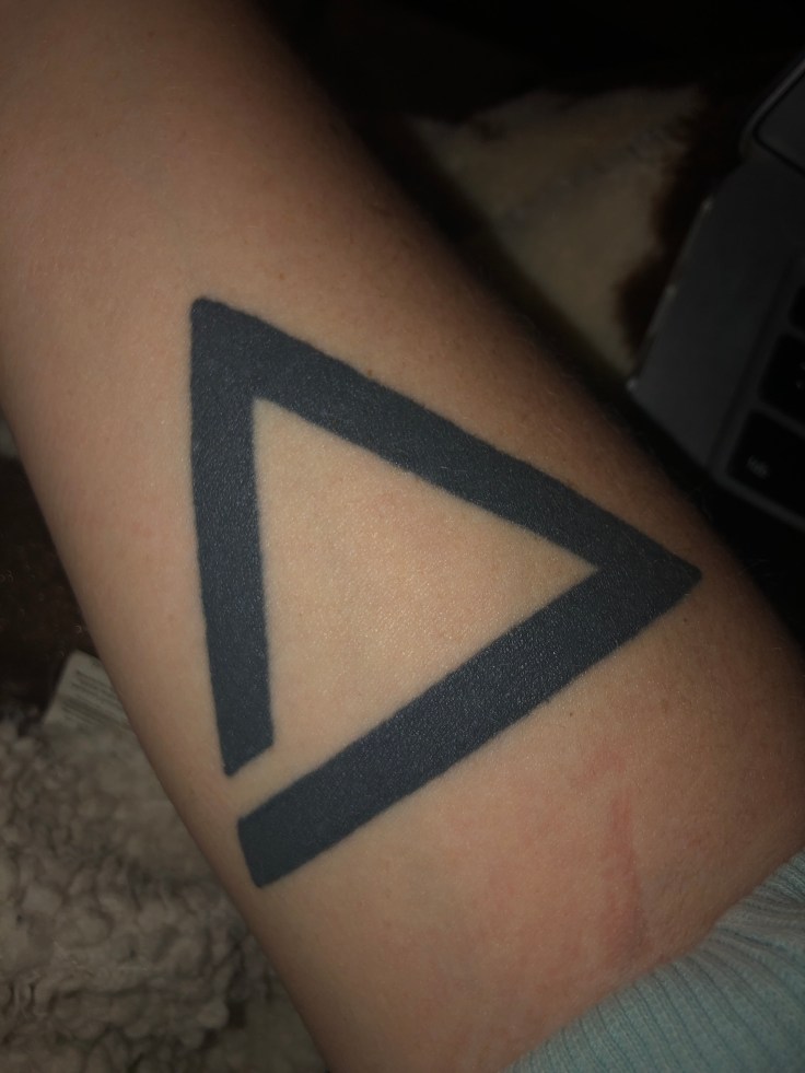 Once or twice a day (usually at work), I have others ask me what the tattoo on my arm is- what it’s meaning is. “A triangle,” they say.. and then giggle. A triangle, yes, but it’s much much more.. and more than just a cover up..